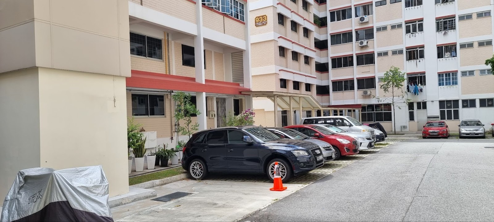 2. After the shelter, turn left and you will see the service lift with Block 933 in the background.