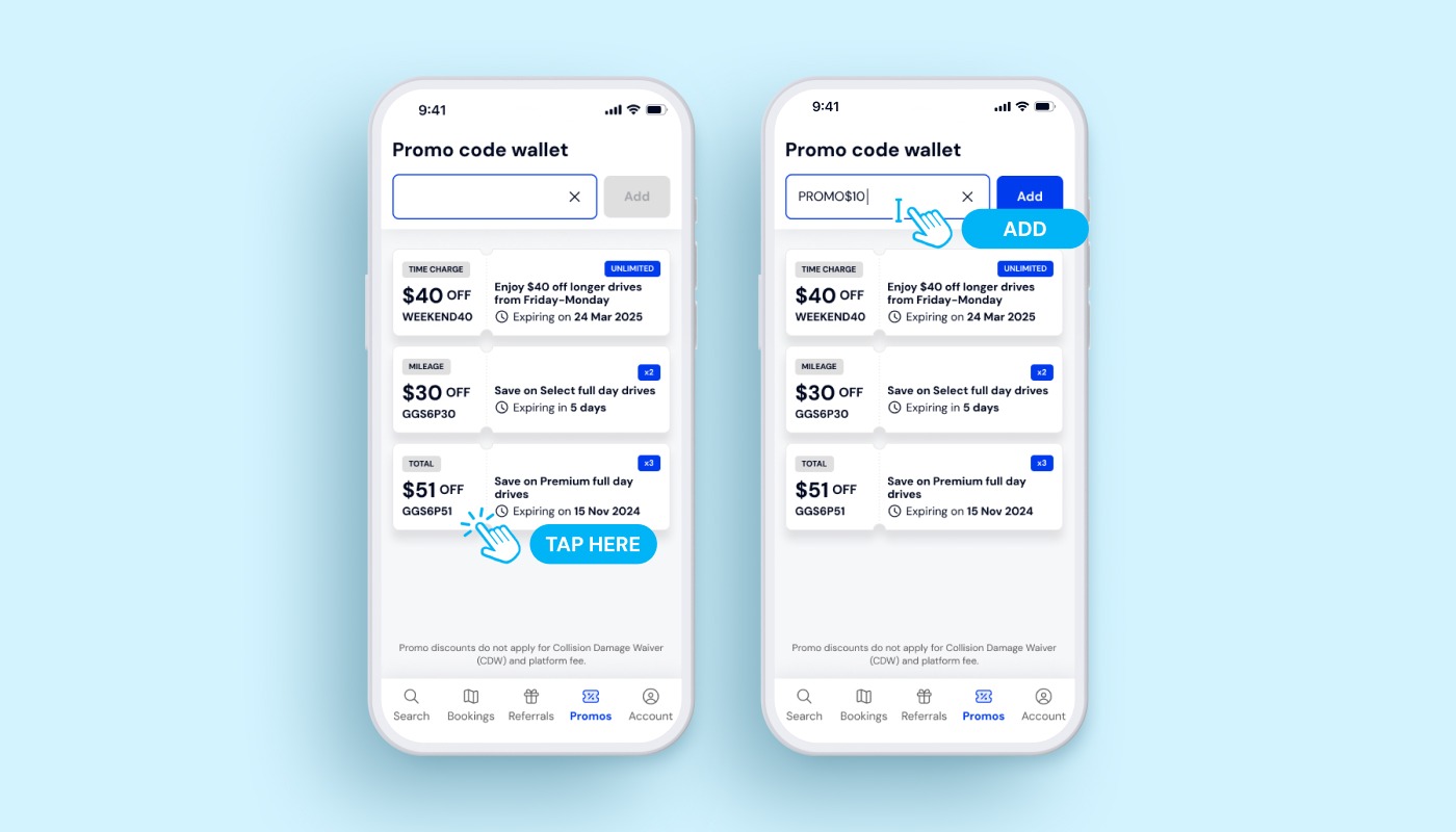 The promo code wallet is where you can get an overview of all the GetGo promo codes you have. You may also add new promo codes to your walletfor your future bookings.
