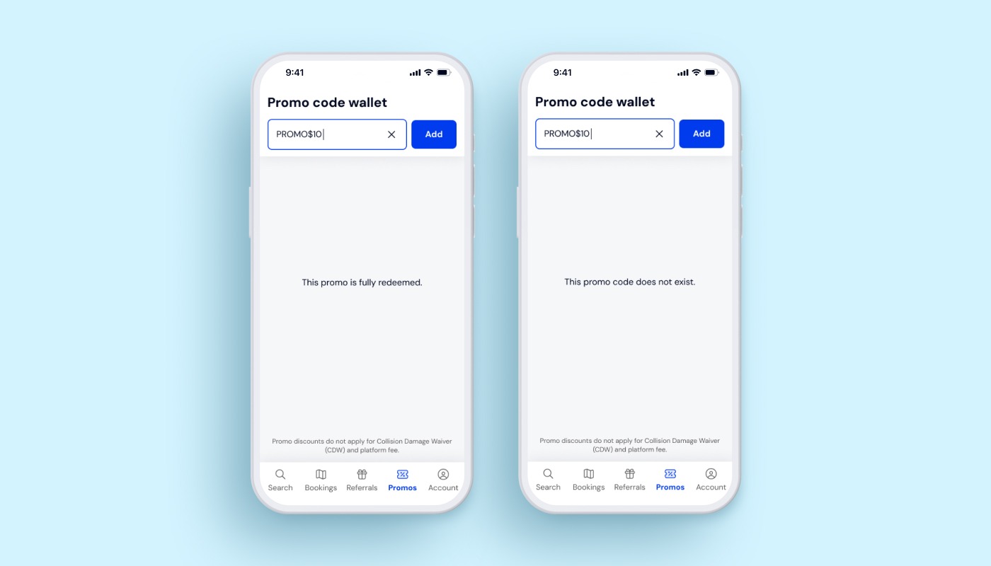 What if I receive an error message? Scarlett October 22, 2025 01:11 Updated Should you receive an error message, it is likely that the promo code you’ve added is: An invalid code (i.e. the code does not exist) Fully redeemed Expired Related articles Why am I getting an invalid error message when I’m trying to book a car? In the event of a cancelled booking or failed payment, will I get back my promo code? What is a promo code wallet? Can I add new codes to the wallet? Why am I not able to make a booking? How do I change/add my credit/debit card?