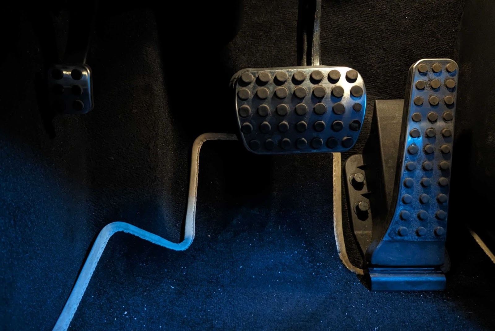 - To engage the foot brake, locate and step on the small lever beside the brake pedal, as shown in the image below.