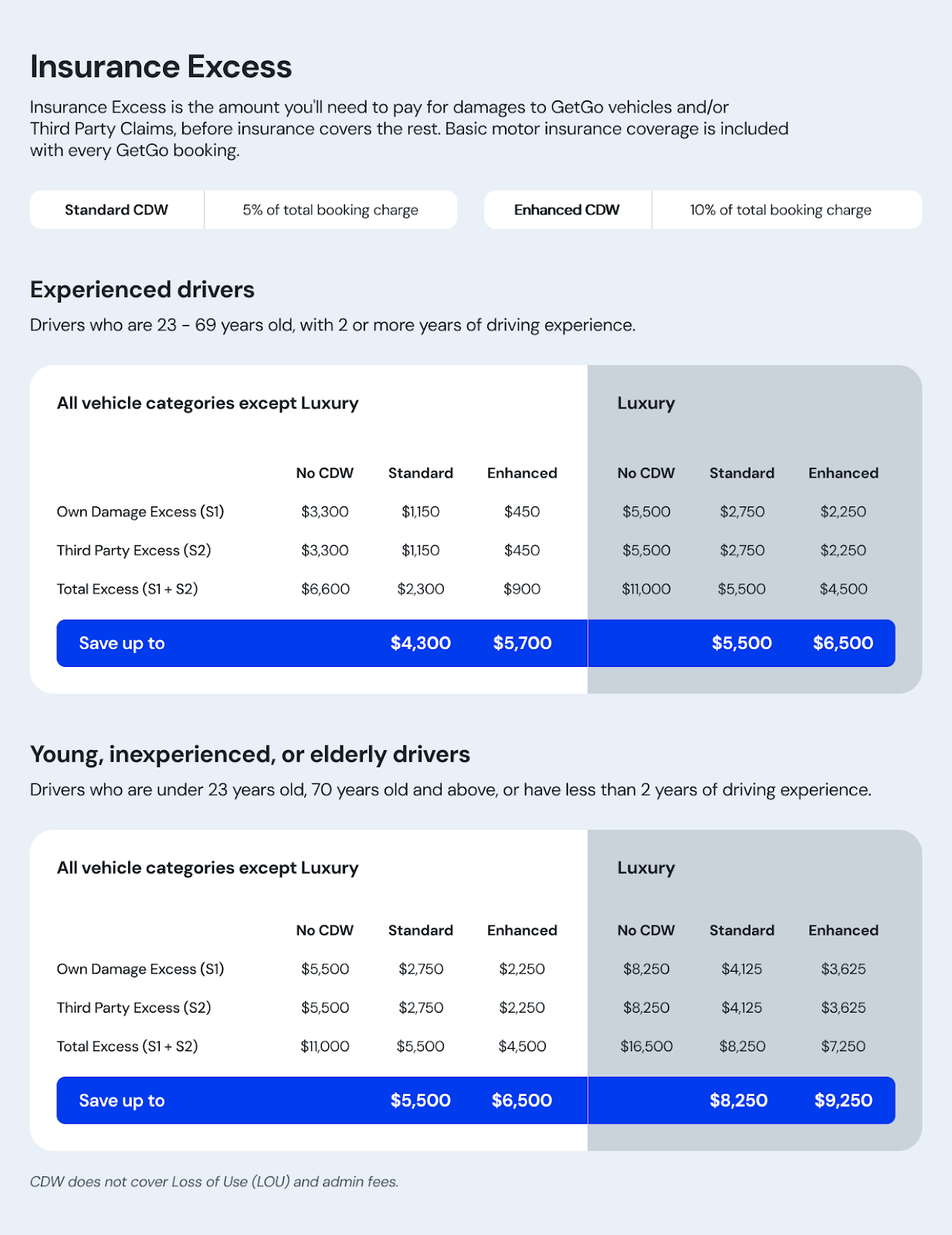 To help you make the best choice for your needs, we've outlined the differences between our CDW options. Below is a table that compares the Total Excess you’d have to pay if you choose the Standard CDW, Enhanced CDW, or if you choose not to be covered by CDW at all.