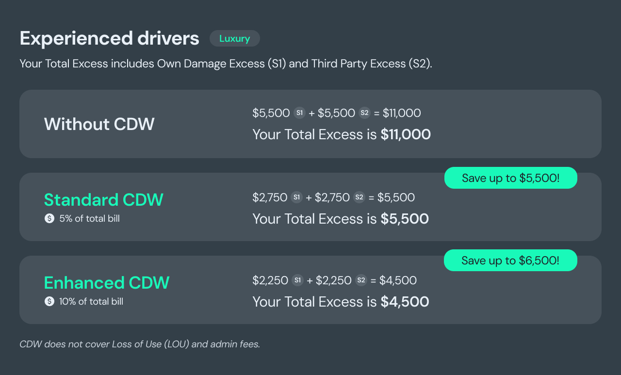 By choosing the Standard CDW, both S1 and S2 are lowered to $2,750 each, which means that the Total Excess would be $5,500.