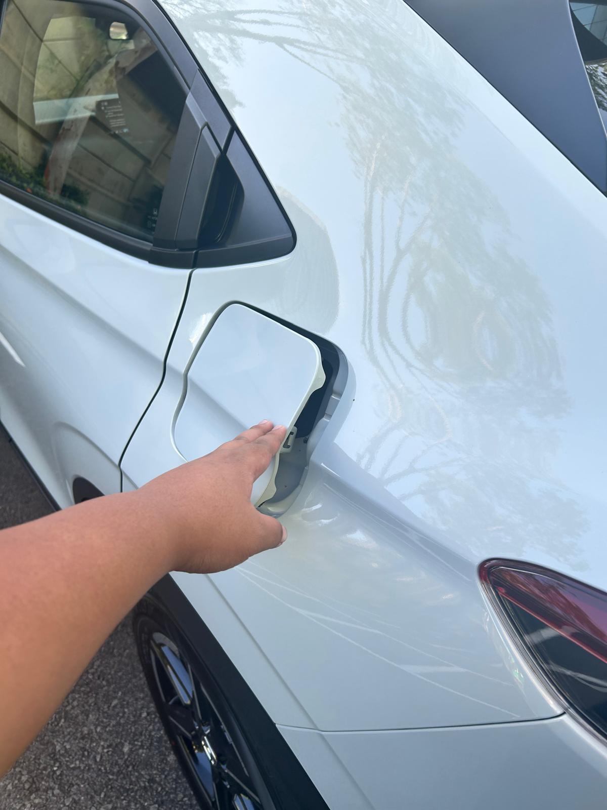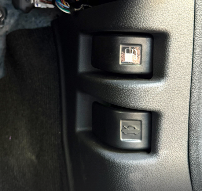 - The fuel door button is located at the bottom right of the steering wheel, as shown in the image below. It has a fuel kiosk icon on it.