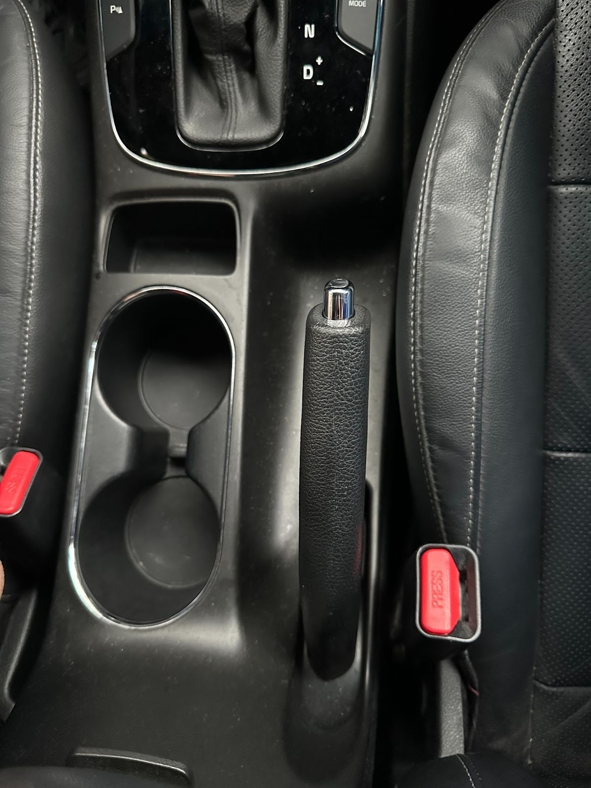 - Release the handbrake by pressing down the button and pushing the lever down to start driving.